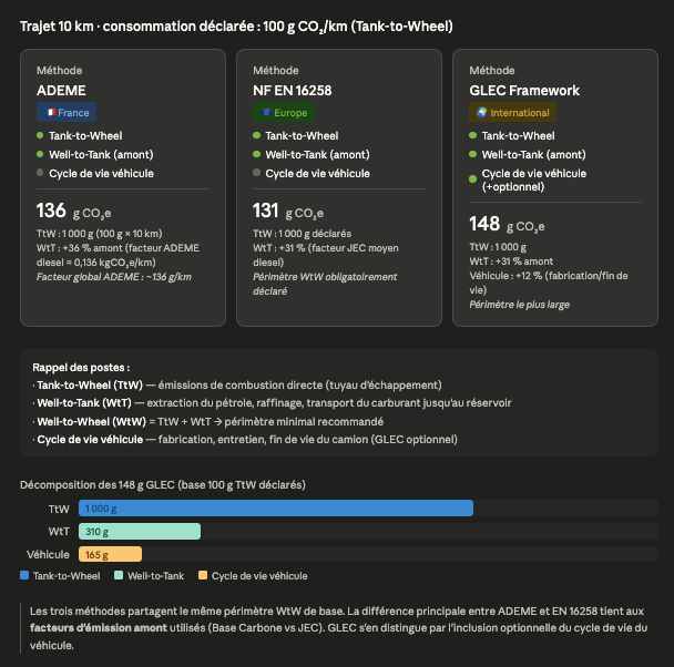 | Périmètre | Well-to-Wheel | Well-to-Wheel (déclaré séparément) | Well-to-Wheel + cycle de vie (optionnel) |
