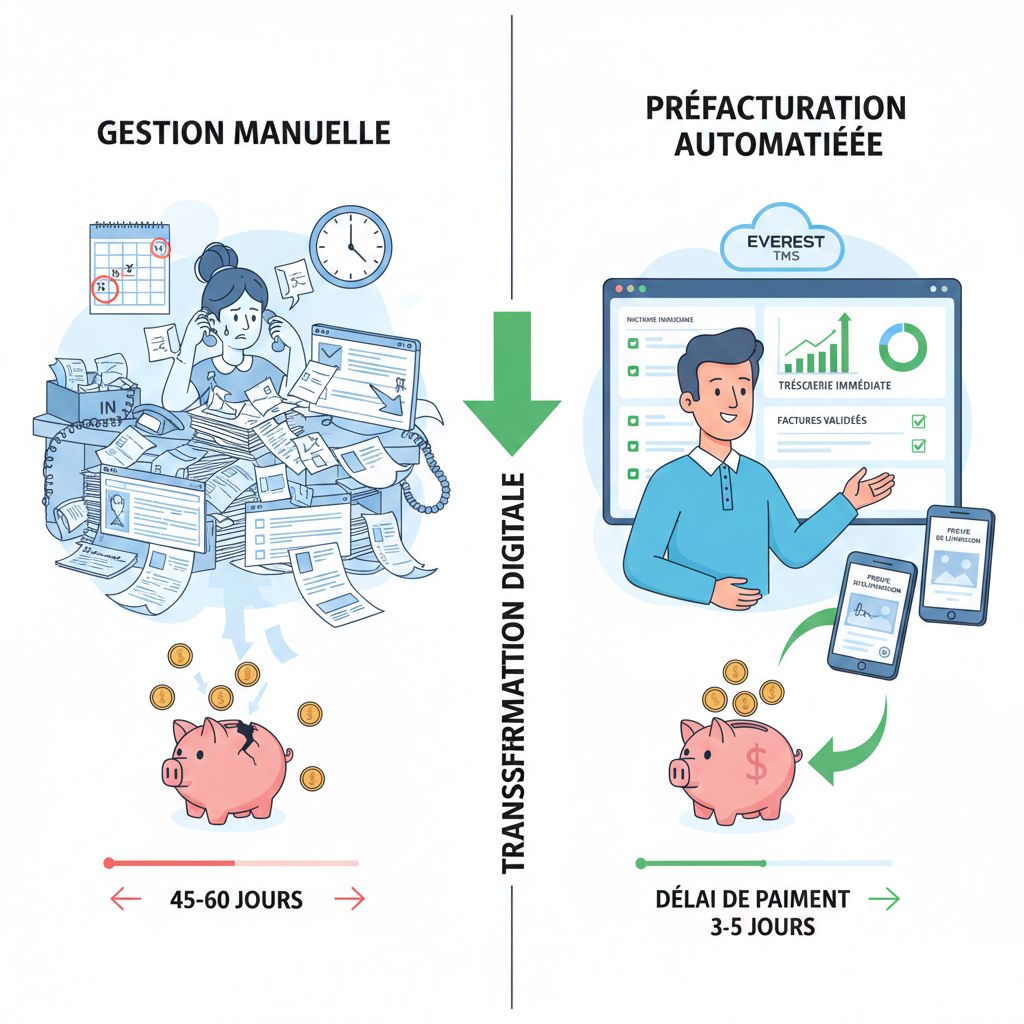 La trésorerie reste le nerf de la guerre pour toute entreprise de transport. Pourtant, des milliers de factures dorment dans les tiroirs des services comptables, en attente d’être validées, envoyées ou réglées. La préfacturation automatisée transforme radicalement cette réalité en accélérant les cycles d’encaissement tout en libérant un temps précieux pour vos équipes.